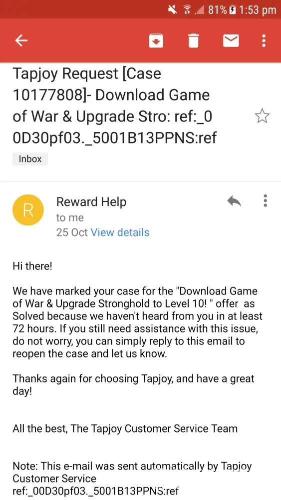 Note: This e-mail was sent automatically by Tapjoy Customer Service