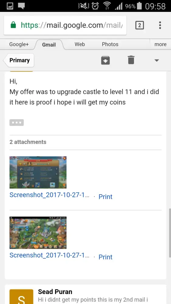 Hello, again. I responded to this message on 6 October 2017 at 9:10 am. As I have not yet received a response, nor the award of the rewards promised, I am sending the requested screenshot once again, with the hope that this matter will be resolved expeditiously. It has been at least four days since I completed the offer; whereas your company promises a two-day turnover. I anticipate your quick response. Thank you.