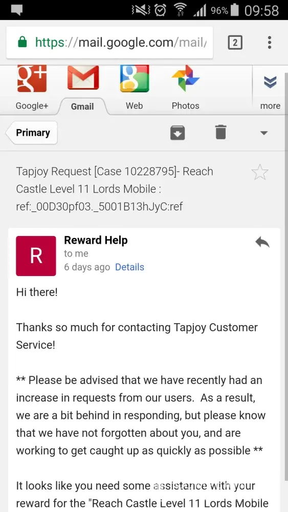 Hello. This case is still unresolved. I would appreciate it being sorted soon. There is also this one: (Tapjoy Request [Case [protected]]- Reach Level 20: Legacy of Discord -:ref:_00D30pf03._5001B12wol7:ref) which I have been trying unsuccessfully to have resolved for weeks now, with no response yet, and I have sent numerous emails regarding that one. I have tried to be patient, but I hope that you can appreciate that confidence in your service and promise to resolve things within two days — especially after so many failed attempts over such a period of time — really stretches the limit. While I understand that you have many cases to which you must attend, I would expect priority to be given to those that have been unresolved for such a long time. If both cases could be resolved quickly, I would be very grateful.
