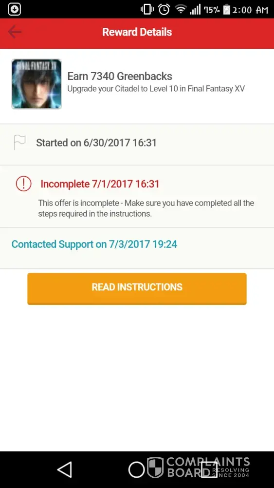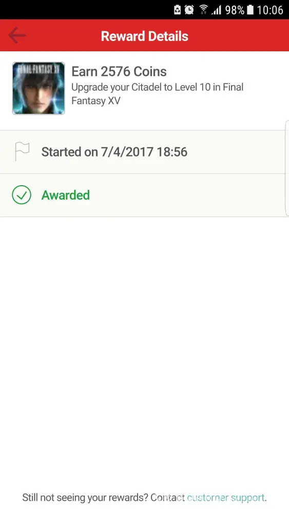 I completed the 2x 7340Greenbucks offer on July 2nd for Final Fantasy XV (Build a level 10 citadel), well before the event even ended. Still says INCOMPLETE on the tapjoy reward system.. I have sent numerous emails to Japjoy along with photographic evidence of completion. I have received zero response from tapjoy and no reward. I spent real money to complete this offer and over a dozen hours invested... I will be filing a formal complaint on every social site available and will never used tapjoy again after thus of notice fixed.. Totally in have over 15000 greenbucks that have nothing been paid, which is hundreds off dollars worth.. This seems too be a common thing this company does.