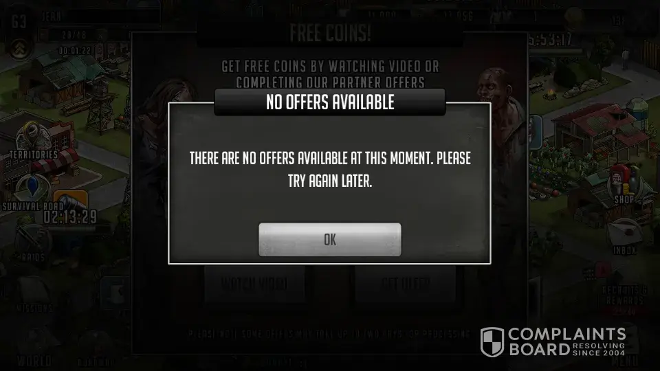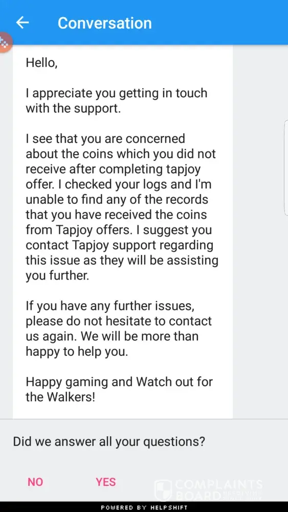 I did a offer for 504 coins for my walking dead game using the free offers thru tapjoy. I did everything I was suppose to do an have wrote several times with no response back except from a automated reply. its been almost a month an still nothing. all I want is what is due me. the offer was for a twitter account. Tapjoy Request [Case [protected]]- Install and Register for Twitter! : ref:_00D30pf03._5001311OsVi:ref