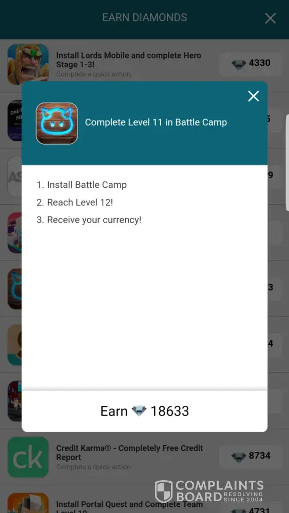 After doing so I received no diamonds and the offer also remained on the list as If it were not completed, therefore leaving me unable to complete a complaint form as the offer wasn't showing in the completed section.