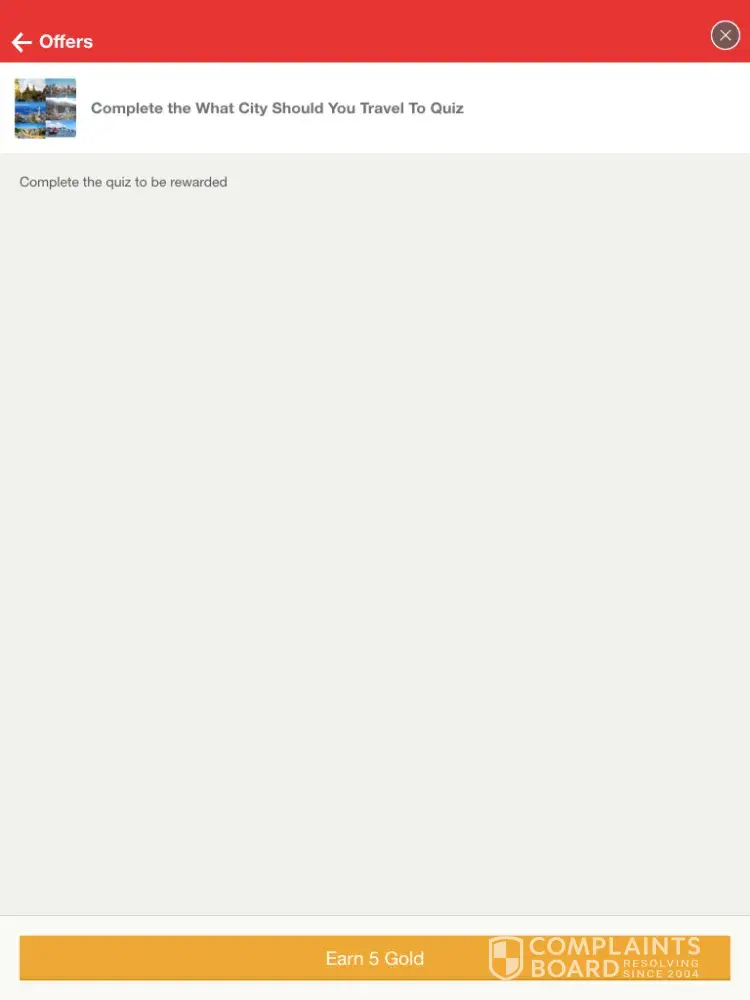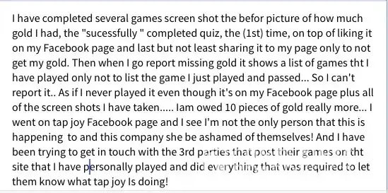I'm uploading the pictures this is a scam. Did everything and still wasn't rewarded my gold then when I tried to go report missing gold it pulls up a totally different game tht I didn't play even though I have all the proof and my Facebook page clearly states tht I took the quiz and passed it... Tap joy Facebook page have a lot of the same complaints.