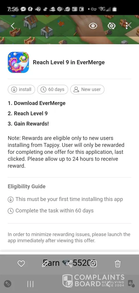 The latest example is accepting offer to download and play EverMerge and reach level 9 to get paid 43585 diamonds in Design Home game. I have completed the offer, never got paid, I have sent a screenshot to prove offer completion, tapjoy refused to pay.