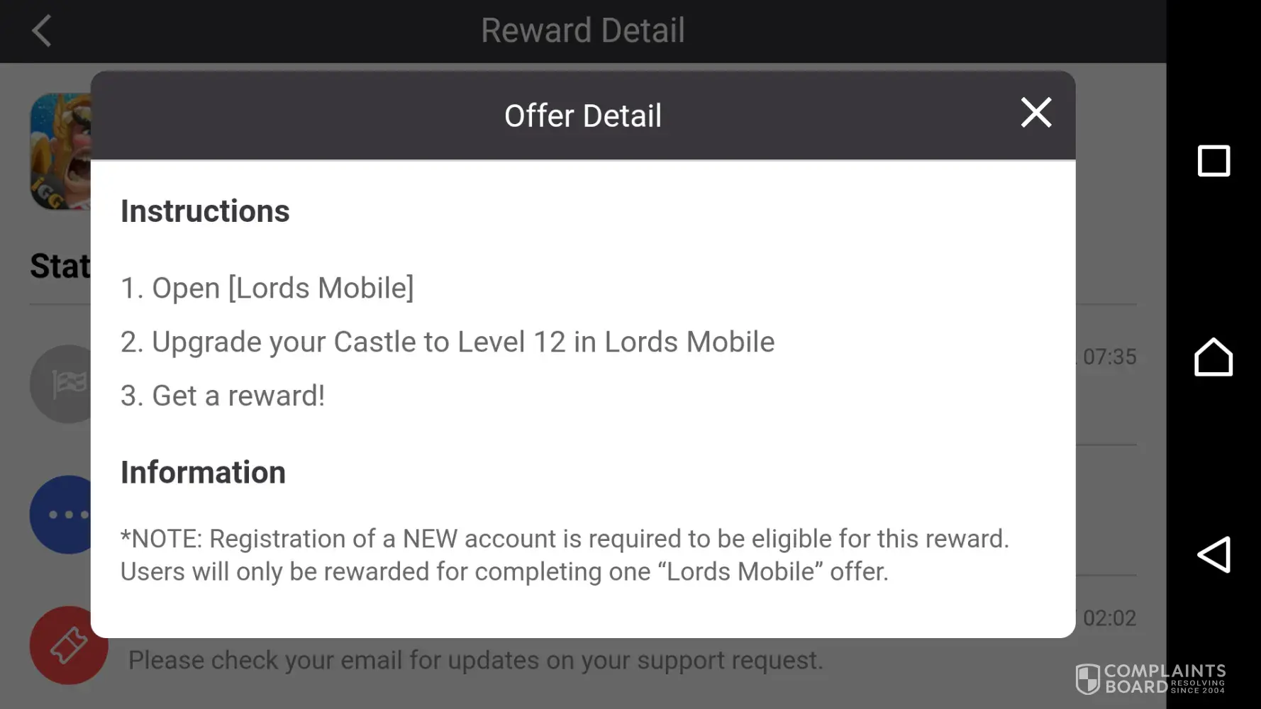I've completed the offer in 8 ball pool about downloading Lord's Mobile and Upgrading my castle to Level 11 but I still haven't received my reward/coins yet and it's starting to get frustrating especially when I spent my time and effort to complete that offer for nothing. I have already sumbitted a Request Support and they told me to check my Email for response but there was nothing. Please fix this problem as soon as possible.