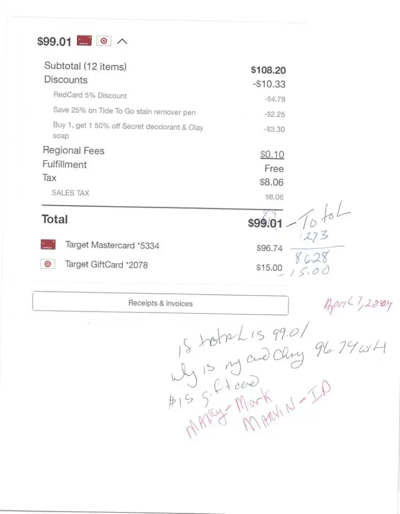 I made order # [protected] online on 02/17-18/24. There was an issue with one item in the order. Therefore, the item was exchanged/replaced. The subtotal illustrated on the receipt for this order appears as $108.20. Additionally, a Regional Fee ($.10) and taxes ($8.06) was charge. The 12 items, taxes and regional fee totaled the order to the amount of $116.36 excluding discount (-$10.33) and gift card (-$15.00) used. Calculating the discount the order total and Target Card charges should have illustrated as $91.03. However, my receipt illustrates a total of $99.01 and my Target Credit Card was charged $96.74. I have attempted to rectify this matter with Target and have not received a comprehensive resolution. Can you please assist me with this matter.