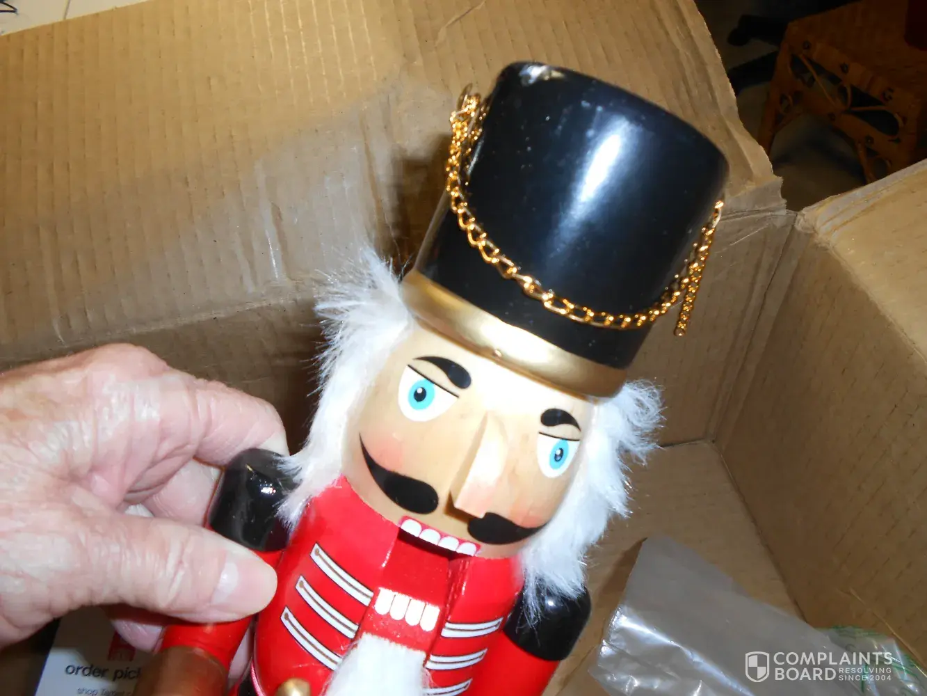 ORDER # [protected] - Placed 12/01/17 - received 12/07/17 --Ordered this Nutcracker figure online to avoid traveling miles to the store etc. It arrived in a very large, damaged box, the item loose and had banged around the whole trip obviously, with about a yard of "plastic air pillow packing" with mostly NO air in it and it was laying to the side of the item. No attempt to protect the item was made. Needless to say, the figure was damaged and broken. Because of the outside condition of the box and the noise inside, I took pictures during each stage of opening.