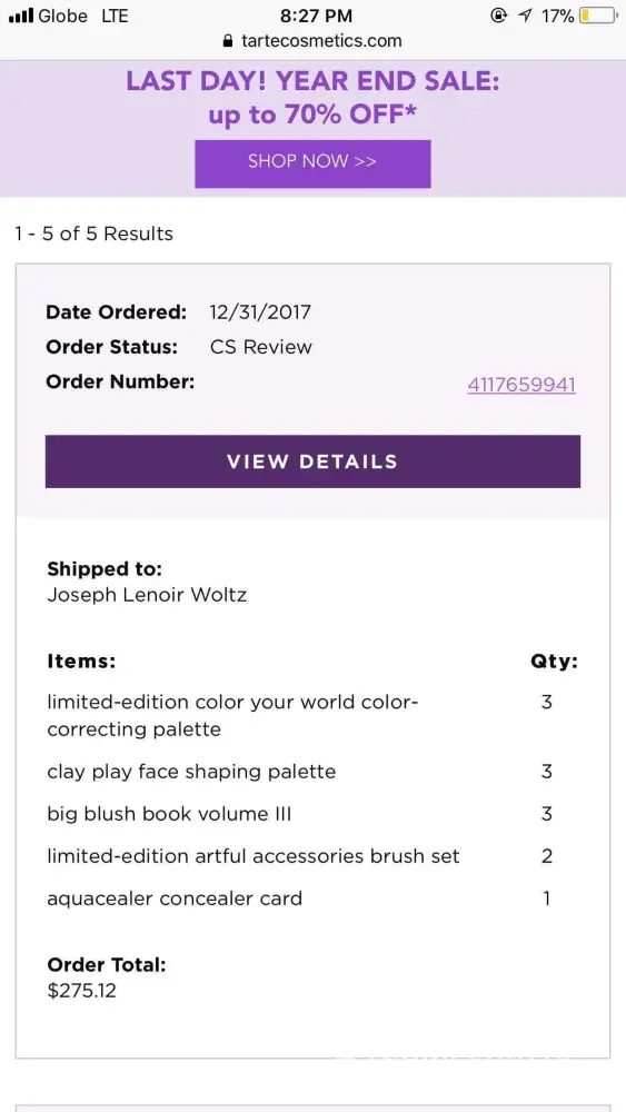 My question is why a well-known cosmetics company like Tarte would do this to "small" person like me and other people. I searched for similar complaints on online, and I found similar encounters like mine, during this "so-call birthday sale." This is not an easy mistake to make, it's more like intentional. They cannot compensate for their mistakes.