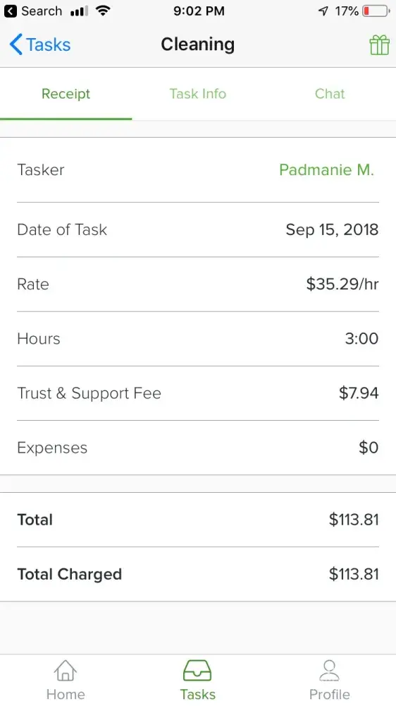 Completed tasks over a week ago and still have not been paid despite client paying task rabbit for my services almost immediately after I had sent them the invoice. Also had no response to my emails. Will be cancelling account if and when I finally receive my money.