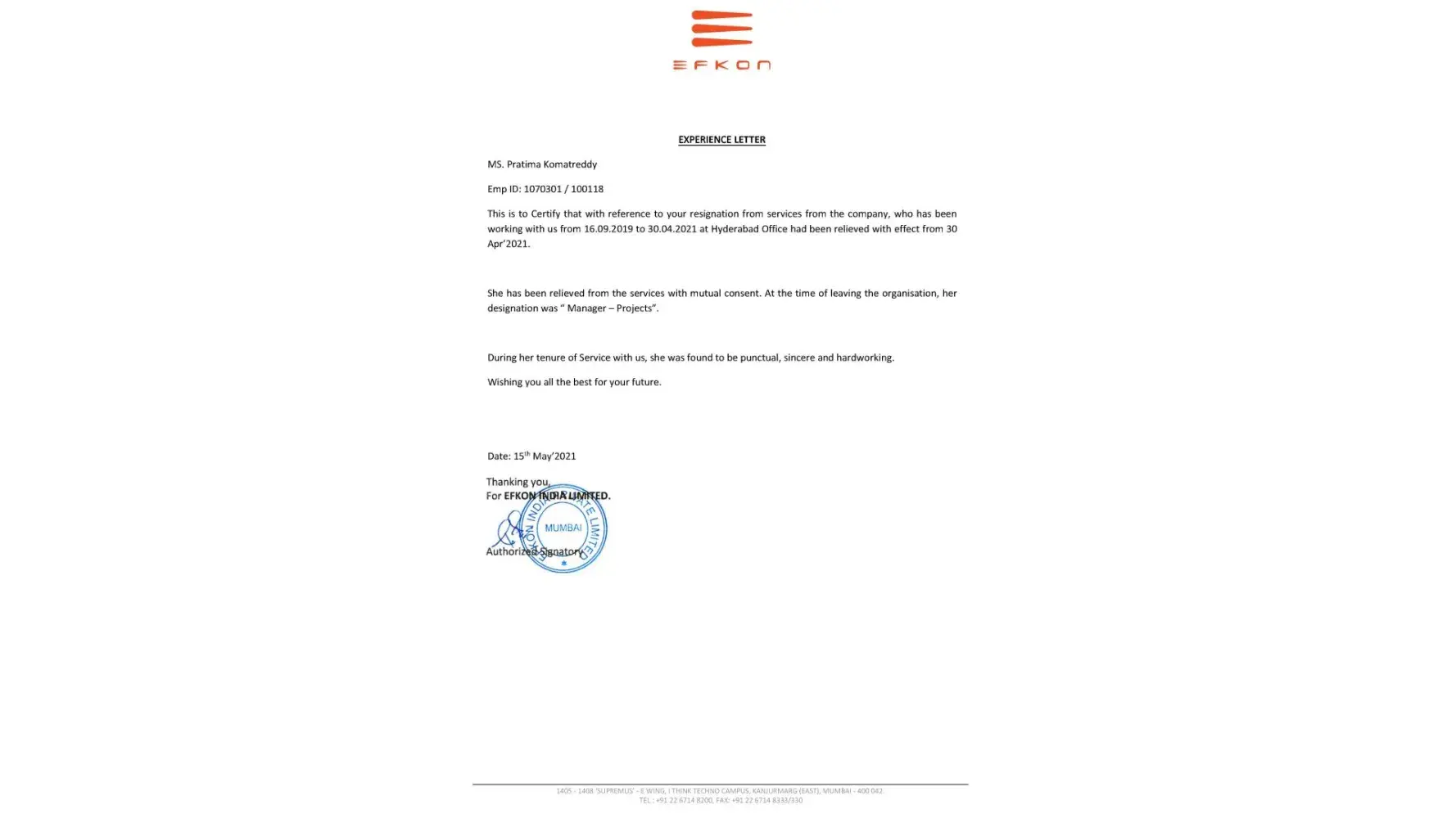 I wanted to bring to your notice about fake experience certificates submitted by Pratima Komatreddy (Known as Pratima Mullapati) who joined TCS, as Senior Manager, Hyderabad on 04.07.2022. She has submitted fake experience certificates for EFKON and Tulip. She was working in Efkon with name Pratima Mullapati wherein she has submitted Experience Certificate from Efkon as Pratima Komatreddy and also used my Signature on Experience Certificate. When I have objected her for this then she filed Fake rape case against me. She has yet to return 1 No. Laptop which she has taken for her kids study from EFKON. I am her ex boss in EFKON and I lost my job because of her fake rape case. You can call me on [protected]. I have reported this matter to Abhi Ruperee HR who is Pratima hiring HR on 10.08.2022 and Pratima filed false rape case on 12.08.2022. All the evidences are enclosed for your ready reference. In case of any further requirement you can reach me on my Mobile [protected].