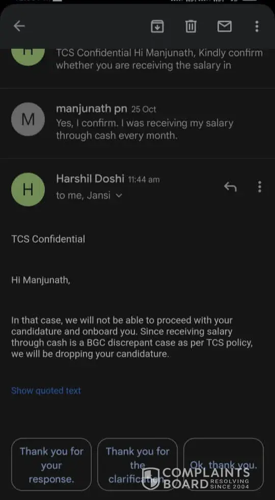Previously I was working with cognizant. And I accepted the offer from TCS, Indore and my joining date is 17th April and my LWD with cognizant on 31st April. I tried to coordinate multiple times with the team but didn't get the proper response and on the date of joining they called me and told me that your BGC is negative. No status and no prior information is provided to me. I asked the team why my BGC is negative they told me that you have not informed us of the company which you have worked. I told them it was 4rth month of experience which is not relevant to my profile so due to which I have not showed to them I do the experience and releiving letter as well. And I have also mailed this to the team before 1 month when I received the BGC call. Now they are not onbaording me and due to which I am stuck in mid and jobless to because of the team. Now, I have left my previous job as well because no information provided to me nor has any of the statuses is been updated in the TCS ibegin portal. This is the prestige and values you propagate is this a Tata Group company that everyone preaches, with all respect I am a sole bread earner in my family. But didn't expect that at the end the things will happen like this.