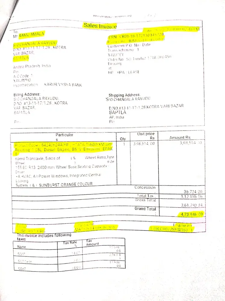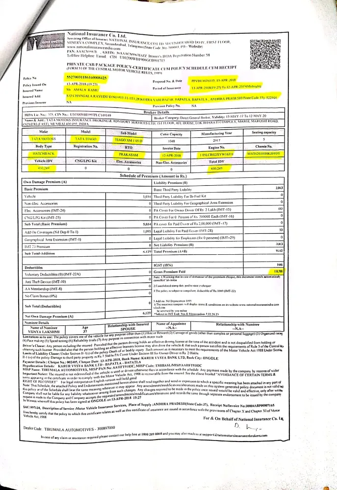 i.e Tirumala Automotives Ongole Prakasam District A.P, the vehicle