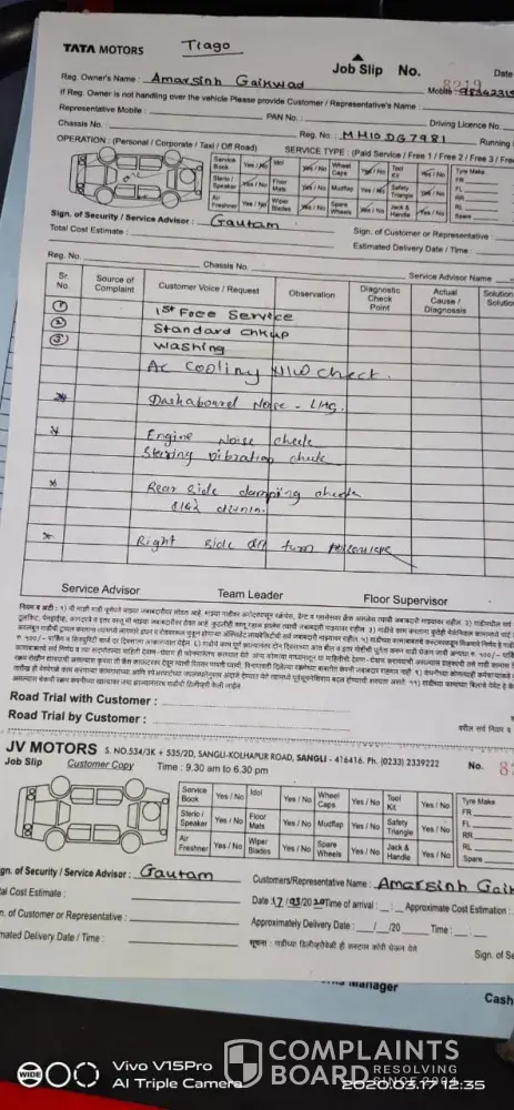I am the owner of tata's TiagoXZ (MH 10DG 7981). I was purchased my car on 21st of January 2020 from Tata's Showroom belongs to sangli that is JV Motors Sangli, Maharashtra. From the date of purchasing I have facing some problems in my car, & I have told about queries to the agent at the time of 1st servicing but they can't help me well enough.