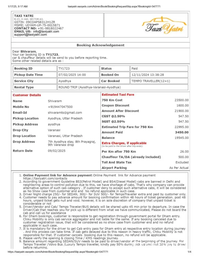 Never ever book your ride through Taxi Yatri. They will never respond to your calls once you paid your advance. They will call day and night to get the booking and advance, and once you pay, you can forget about the money. They will take you for granted and in the last minute they will say vehicle not available. I have booked in Nov 24 for a trip from...