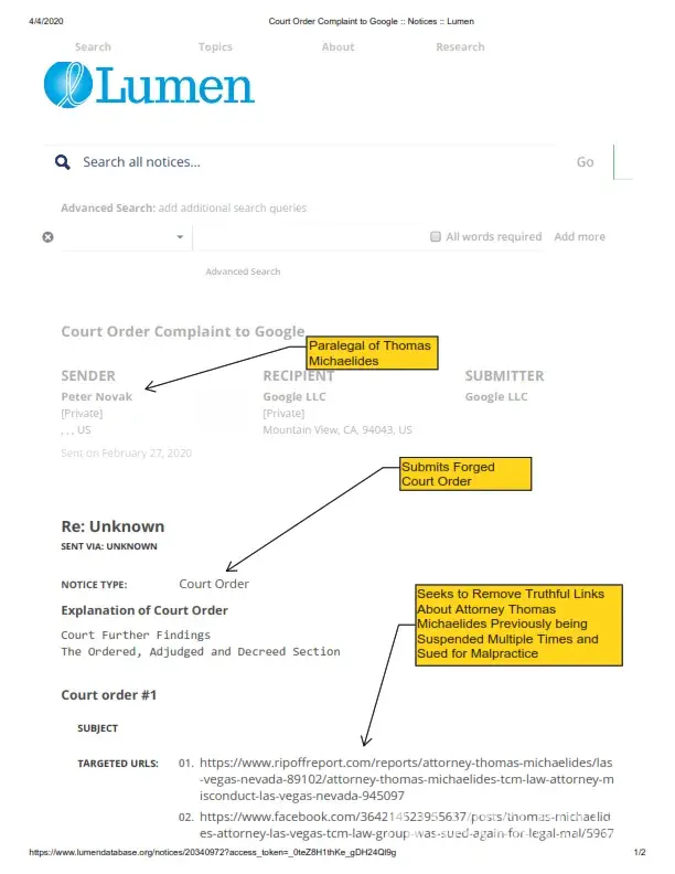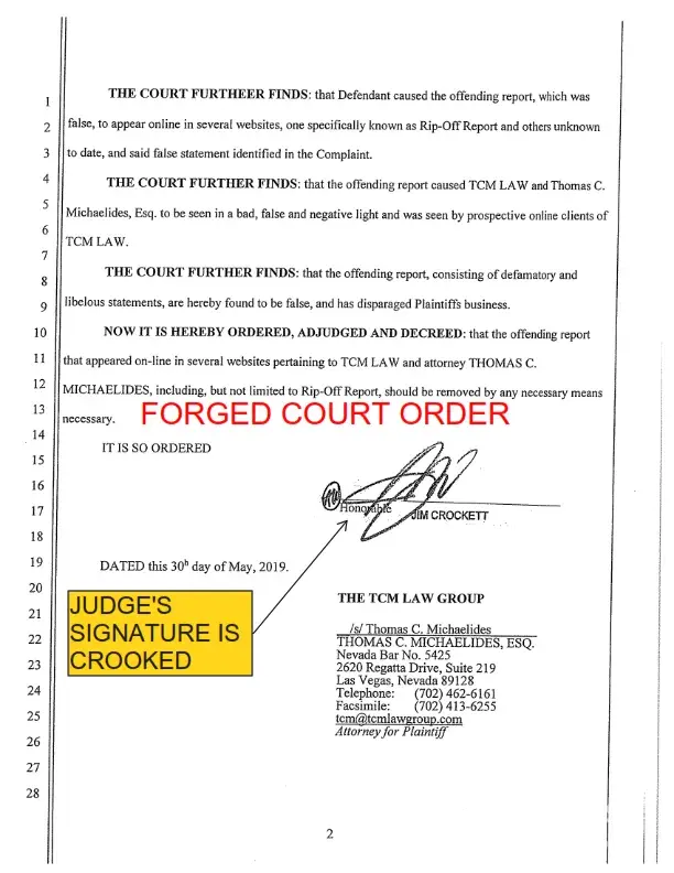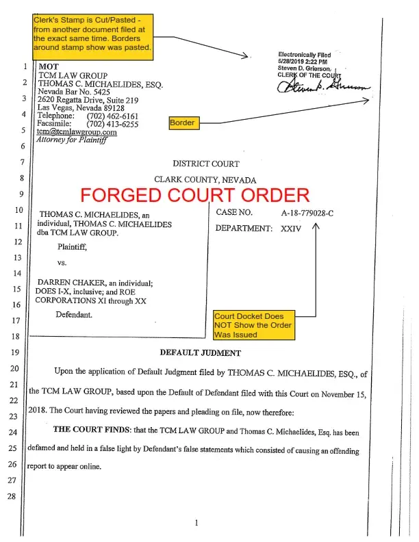 Thomas Michaelides, TCM_Law_Group, Las Vegas, recent court papers filed in Las Vegas court show Thomas Michaelides defrauded the court when a forged court order was sent to Google demanding the removal of links critical of TCM_Law_Group. Some of the posts call out Thomas Michaelides and his horrific past as an attorney such as allowing his paralegal to...
