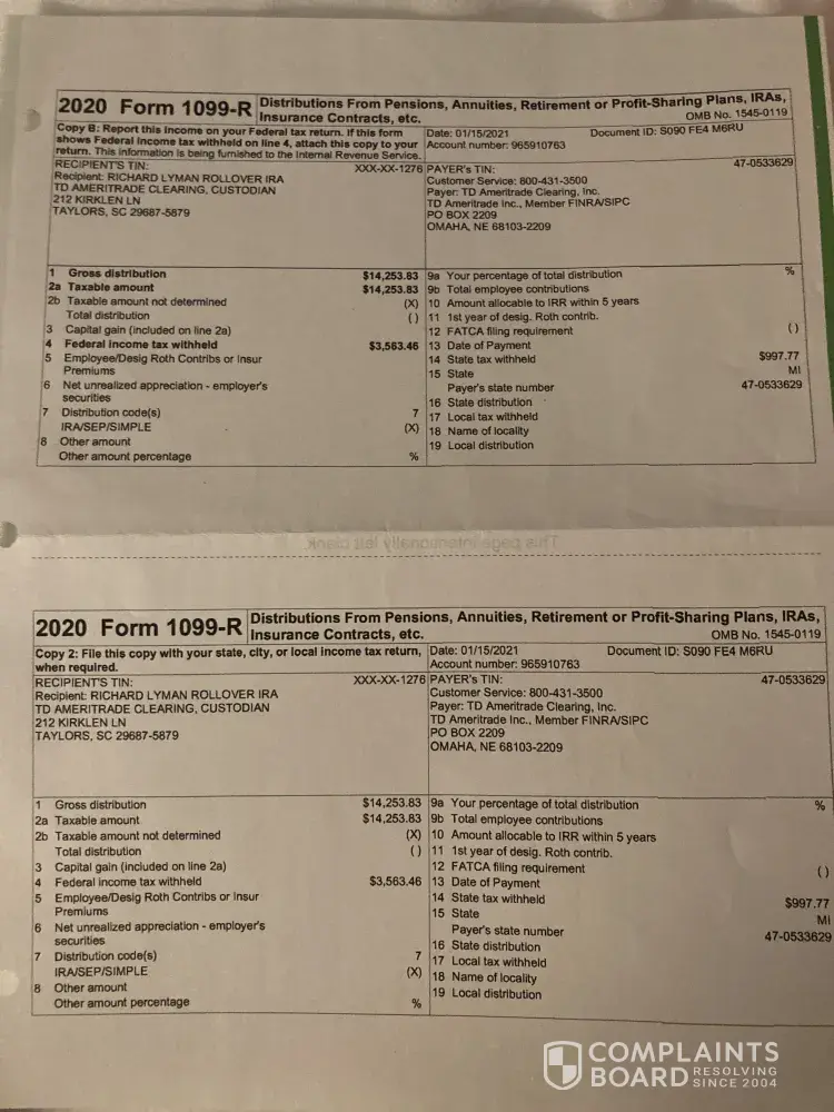 When filing taxes for my late husband (who passed from stage 4 pancreatic cancer last November 2020) and preparing our joint taxes, I came to the realization the TD Ameritrade sent one of his state tax filings in his disbursement to the wrong state (MI), where we lived over 2 years ago. But they sent in another disbursement and state taxes to the correct state, where we are living (SC). When I called and spoke the a representative from TD Ameritrade about sending me a corrected 1099-R, at first they wanted to prove that I was the executor of my late husband's estate, and then they told me to take it up with the IRS! They admitted that they sent the state taxes to the wrong state. So they told me I now had to file a state tax return to a state we haven't lived in in over 2-1/2 years! That cost me $58 filing for another state through my Turbo Tax account.