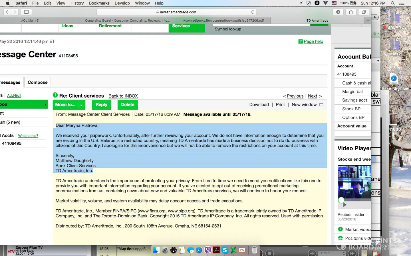 I contacted the SEC and they said they would send my complaint to TD Ameritrade but I would need to seek legal redress if I wanted to pursue the matter. This was to be expected as the SEC has shown over and over it will not regulate or prevent fraud in the markets. Neither company contacted me about their intention to close my accounts. They claim to have sent me an email but they did not and seeing as this is a rather serious matter, there should have been some kind of due process. After MF Global’s theft of customer money, HSBC laundering money for crooks, and a myriad of other crimes and misdemeanors in the financial services industry, I would strongly urge you to take quick action to protect your money.