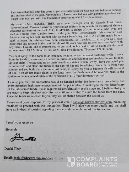 I also just received this scam letter from a Daniel Tiber from Canada Trust Bank. With provided email daniel@tiberwealthmgmt.com
