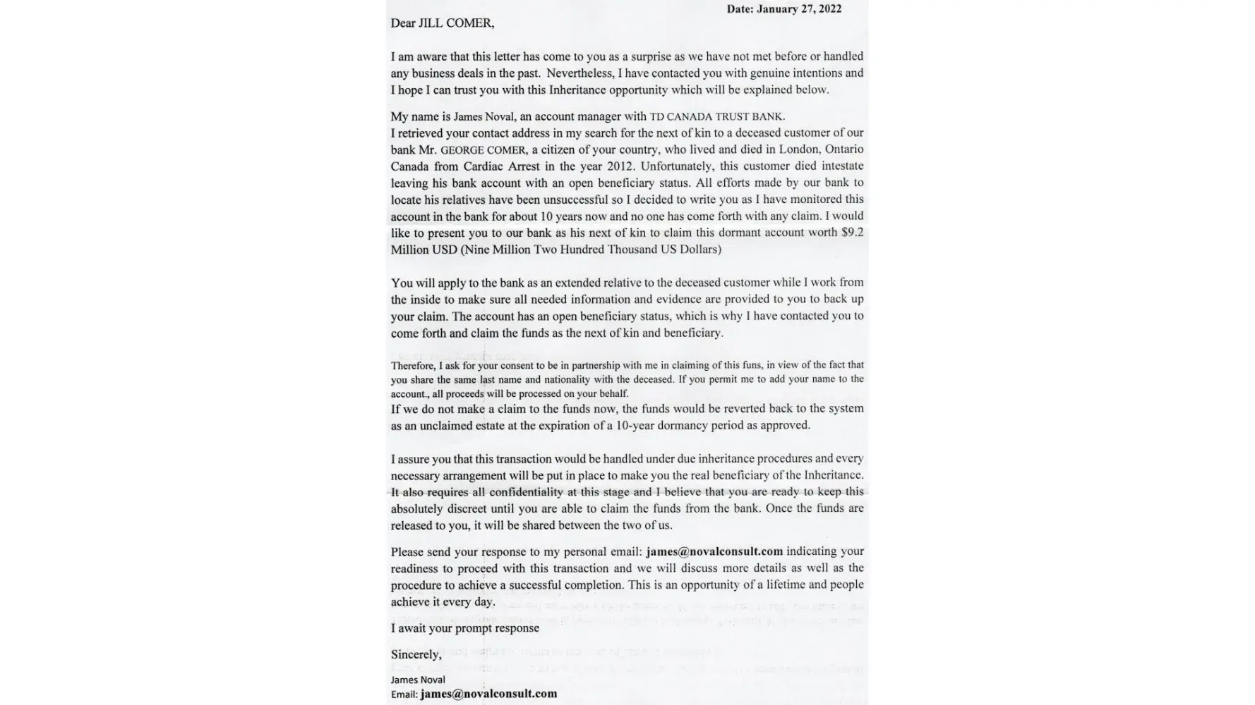 Fake inheritance: Proclaimed account manager of Canada Trust