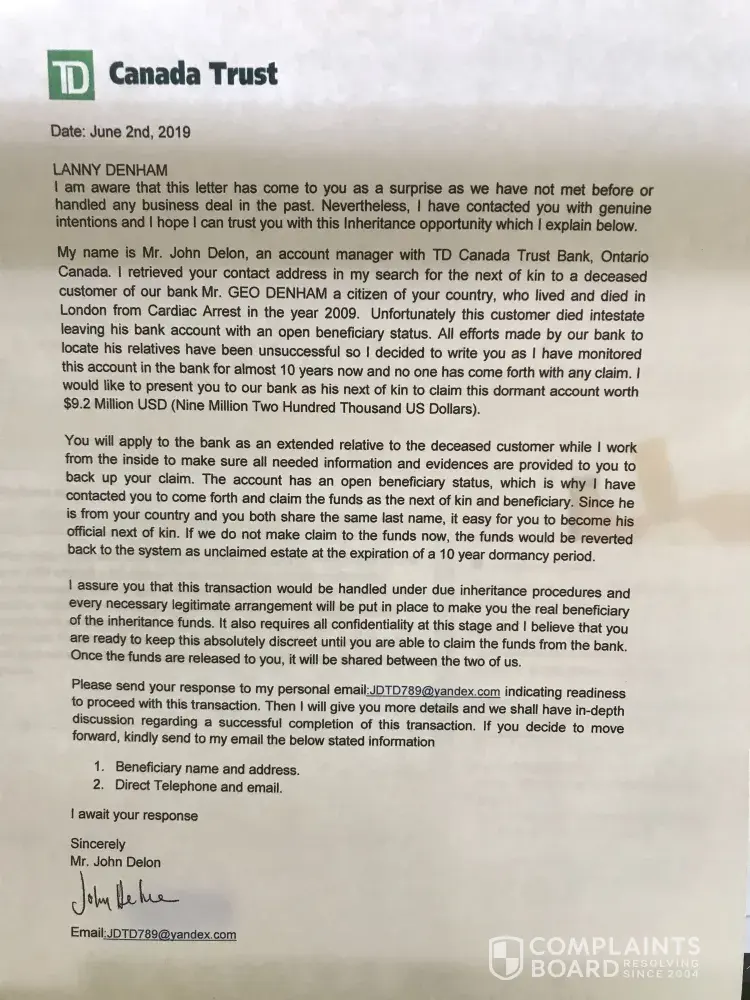 The letter came with TD Canada Trust letterhead dated June 2, 2019. It states that if the funds are not claimed within 10 years of the persons death (2009) they will be reverted back to the bank.