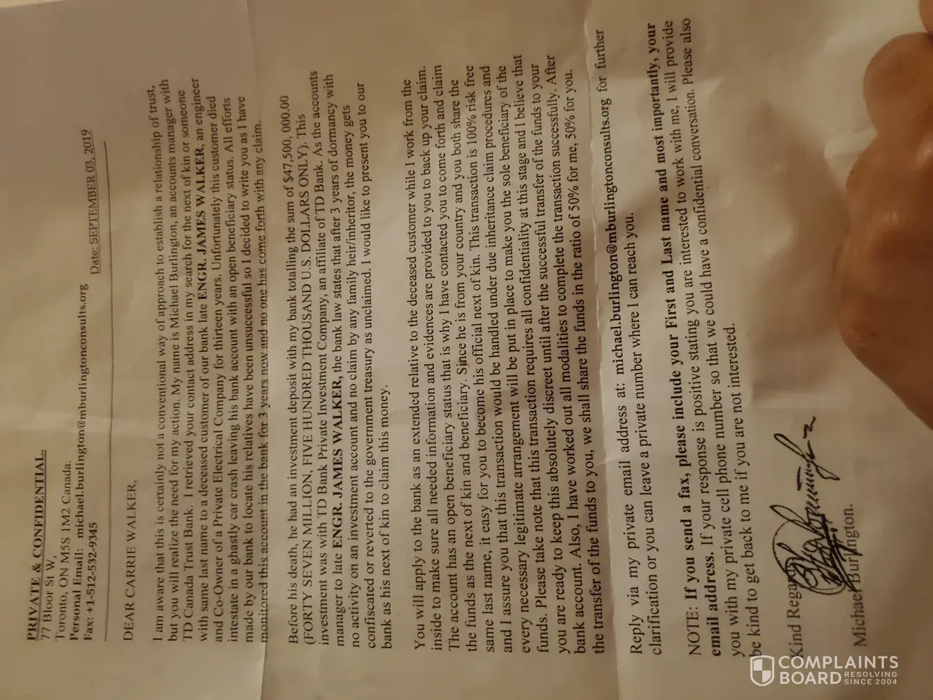 scam letter - michael burlington