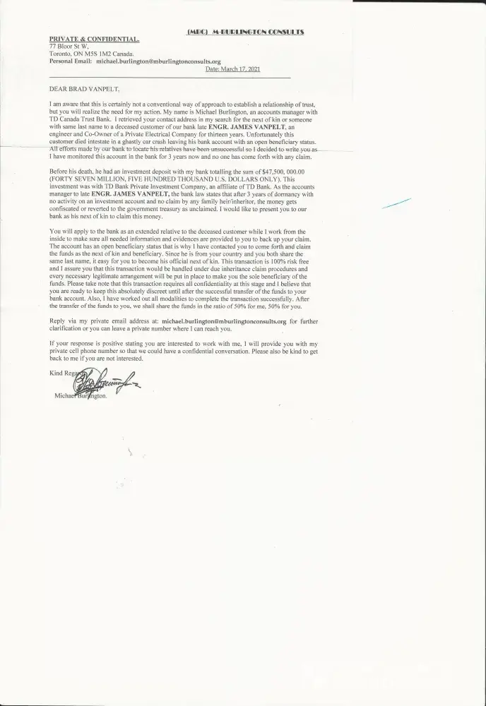 Just received on july 4, 2019 a memo from Michael Burlington using my last name and relating to a $47 million account at 'TD canada Trust Bank'. Return contacts are 77 Bloor St W., Toronto, ON M5S 1NM2 Canada, email michael.burlington@mburlingtonconsults.org and fax +[protected].