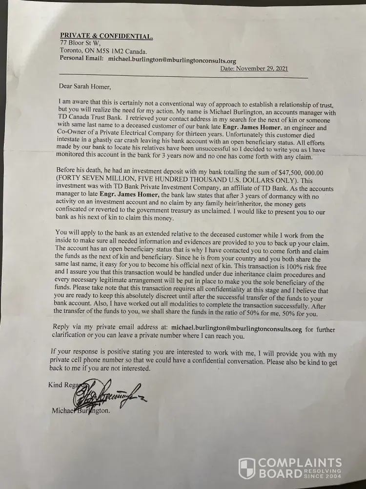 My letter was from a Michael Lightmore at TD bank. He sent me his work ID, and passport. He even sent me a "bank" phone number to confirm the balance of 47,500,00.