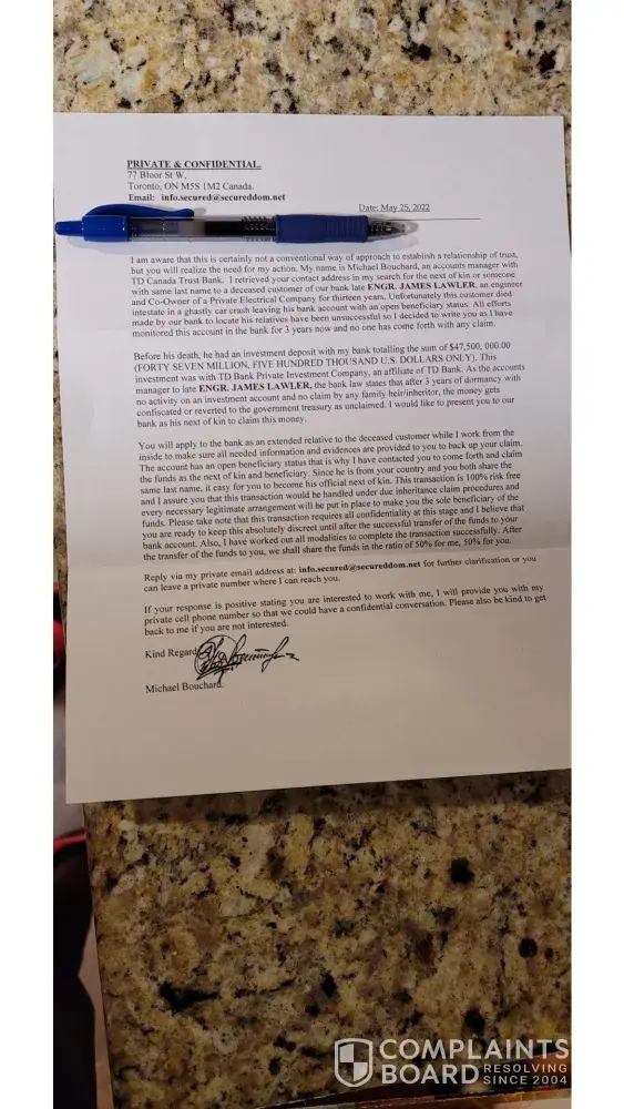 I received a letter dated Oct 10 ,2022 a Michael Torres of TD bank saying a fellow with the same last name of myself had an acct with 47,500000.00 in it needed to be claimed by an heir and you know the rest ,going to split it 50-50-people be aware this guy is a crook.