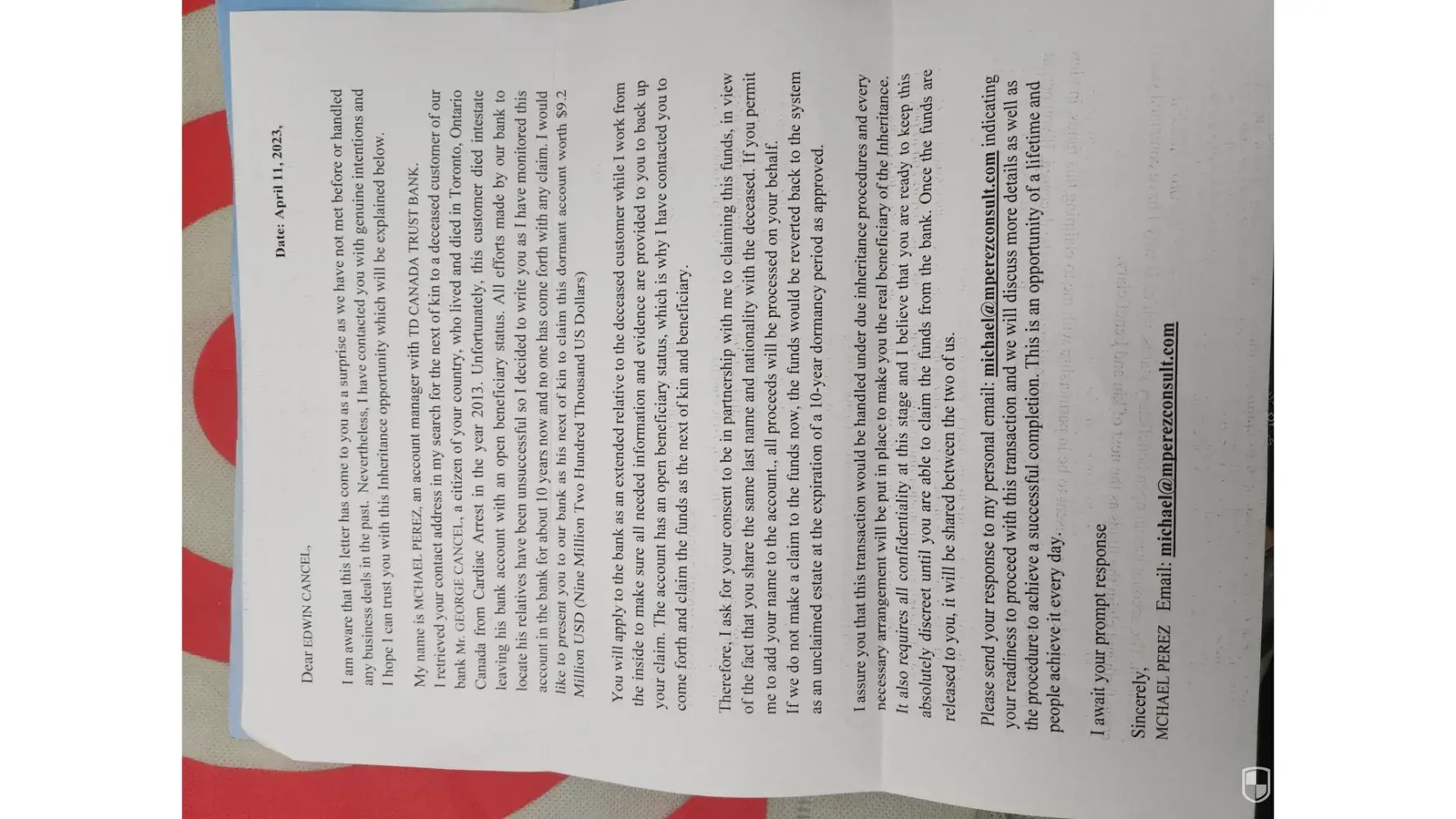 Just got letter today dated for 11-20-2024, says been watching account for 10 years & must act swiftly or funds will result in reversion to the system, says amount of 9.2 million dollars, claiming from deceased man with same last name as mine, gave his email to contact him michael@mperezconsult.com