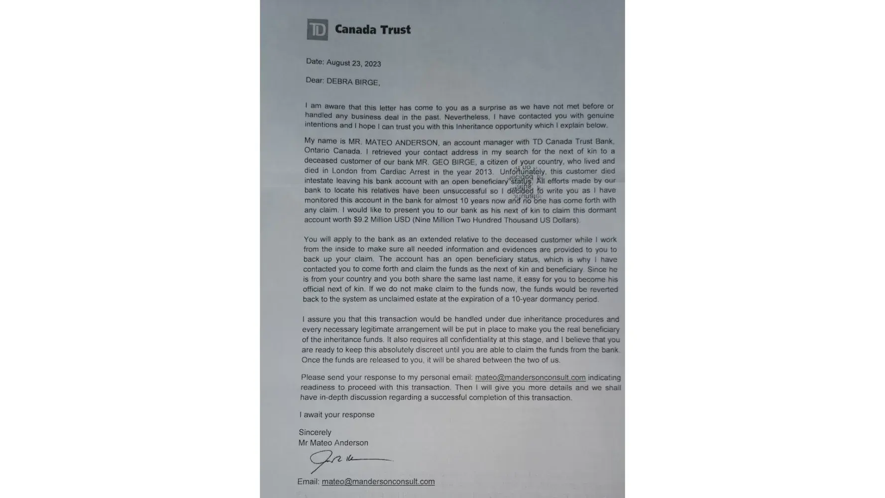 Recently received. Letter from Paul Alfred Thomas, TD Canada Trust Bank, [protected]@gmail.com, stating that I might be an heir to a Joe Granke who died in 2007 in London. Is this for real or a scam? I am highly suspicious especially since the letter is not on any bank letterhead and the city is listed as Ontario, which I know is not a city.