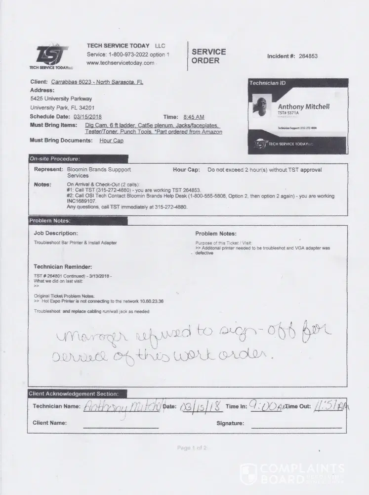 I have a mobile IT business located in Bradenton, Florida and company contacted me for IT support. They lied about my service and refused to pay our agree contract. The service call was to Carrabba's Italian Grill Incident # 264583 on 03/15/2018, I performed my service call in the scope of the work order post with this complaint, they lied and stated I left ceiling tiles that I never touched or wiring management and work undone which is not in the contracted work order.