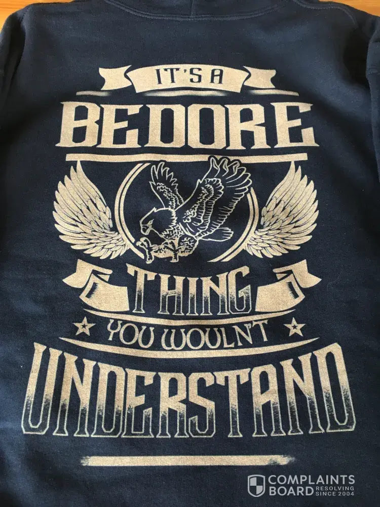 I ordered 3 BEDORE hoodies and when I received them there was a misspelled word on the printed back.