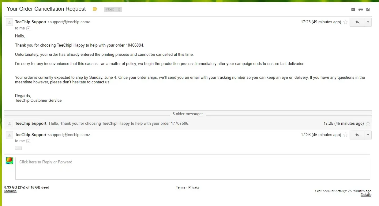 I had bought a pair of leggings and a shirt from teechip I had waited over two months to receive these items in the mail and I had only recieved the leggings and when I try to contact any of the customer support the do not answer the online chat does not respond and when I put in my order number it says that it's invalid ! So I can't even email them about my order