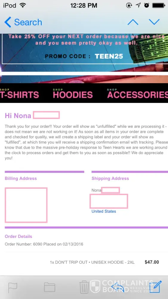 I ordered back in December of 2015. They took out the money as soon as I purchased two hoodies. I ordered one for my sister and one for me so I used her email since she checks it everyday. She emailed them at the end of Jan. Of 2016. They never emailed back. At the middle of feb. she sent an email with the order number and said I wanted a refund. The next day it was overnighted to me. It sucks I had to ask for a refund before they would ship. Now that I know they steal art work from artist I wish I never would've bought them