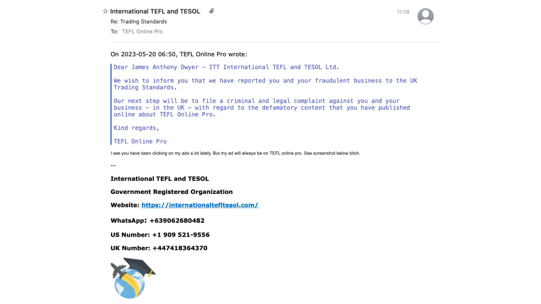 As you can see, the TEFL marketplace is extremely competitive and some rogue programs act in the way that James does; writing made-up garbage that anyone can see is without merit.