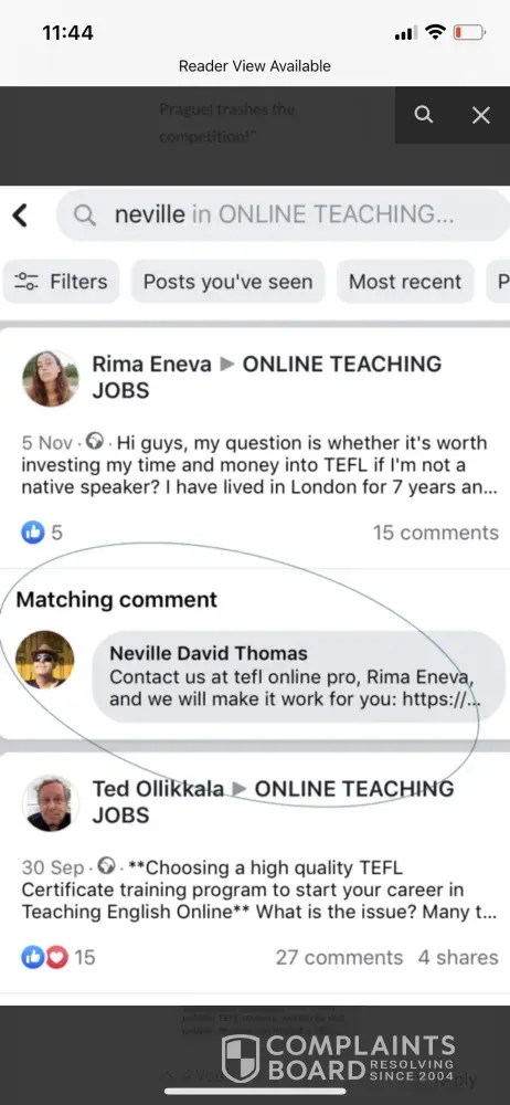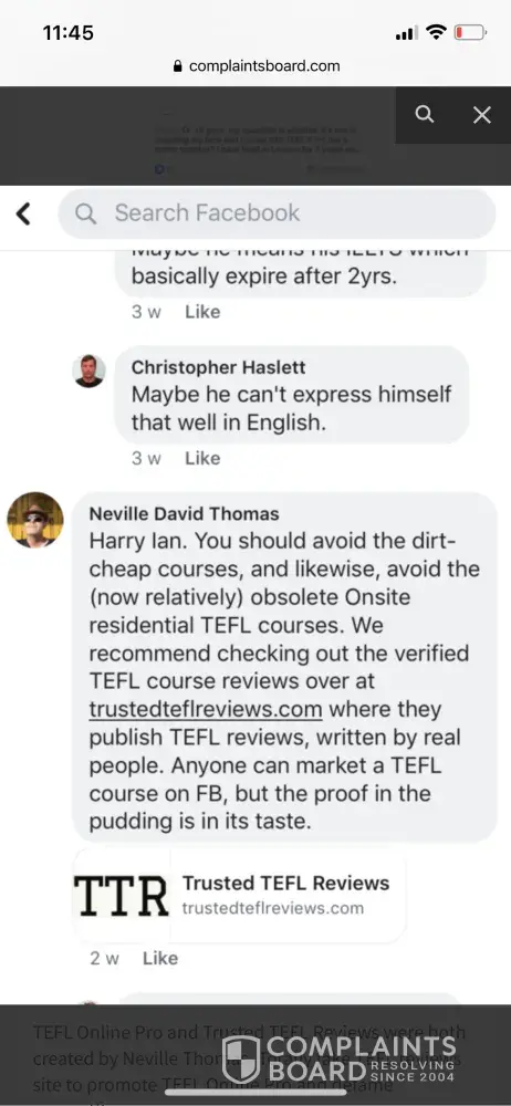 The owner of Trusted TEFL Reviews and TEFL Online Pro is the same. Neville David Thomas has a long history of running fake review sites to attack his competitors. To see more proof look no further than his Facebook posts. This man was caught promoting both the fake review site and his two cent online TEFL school. Neville is the only one writing the reviews on that fake site.