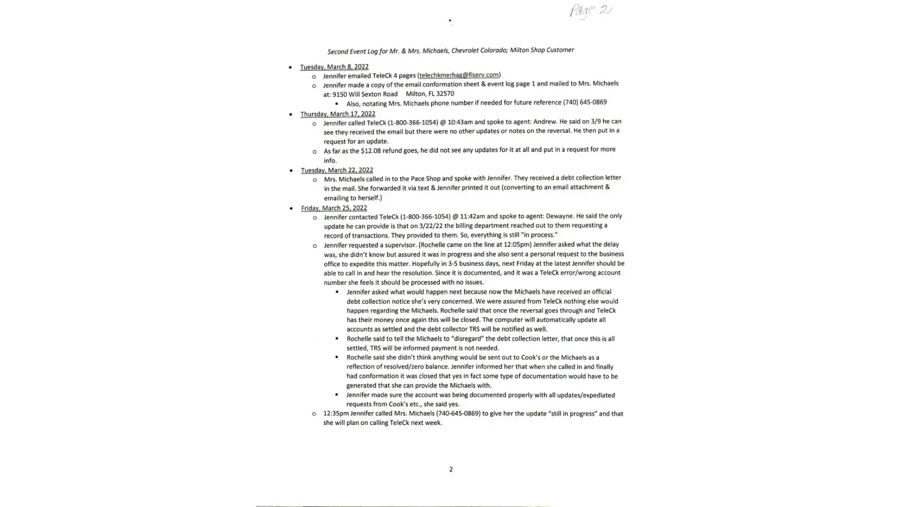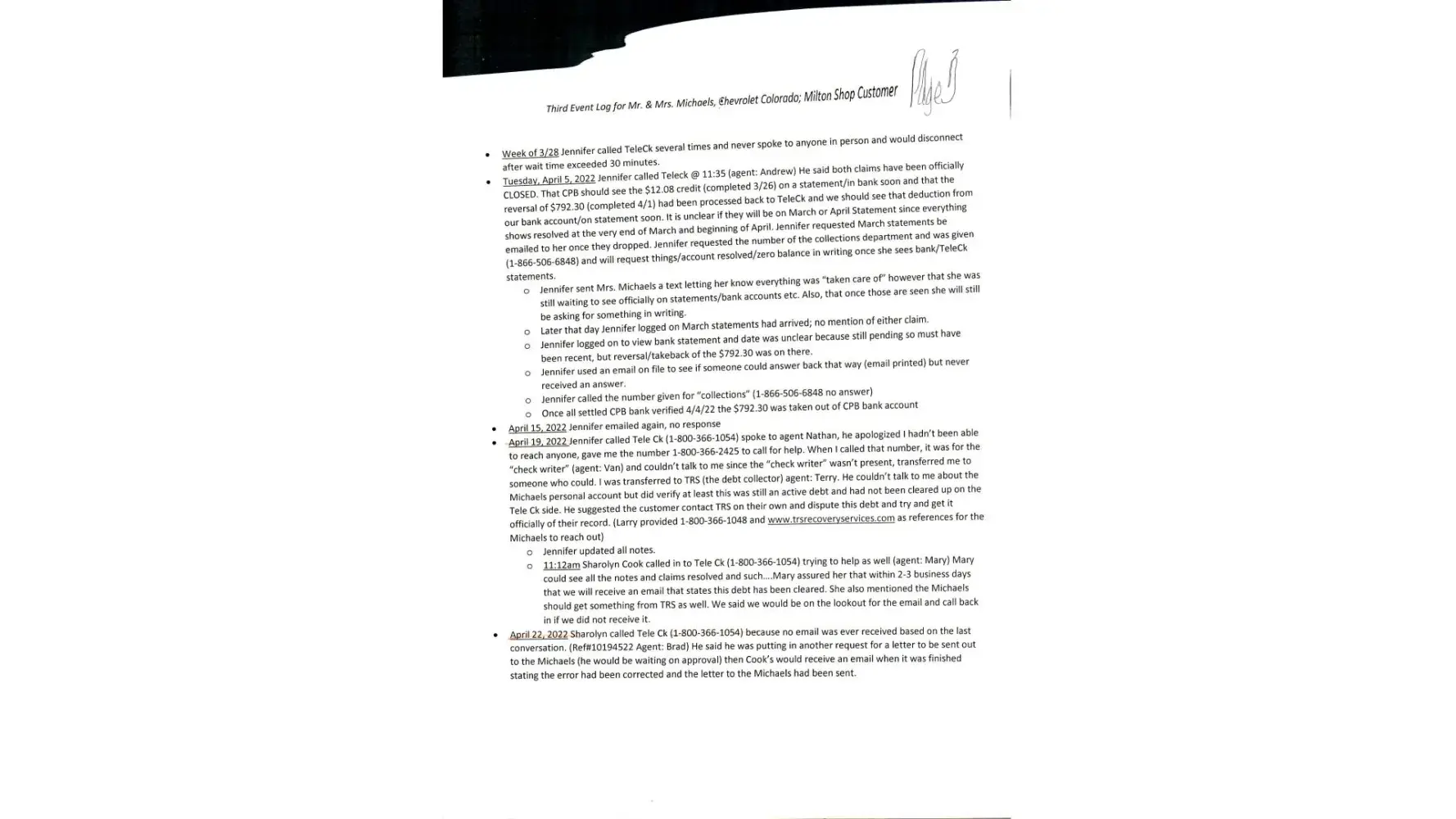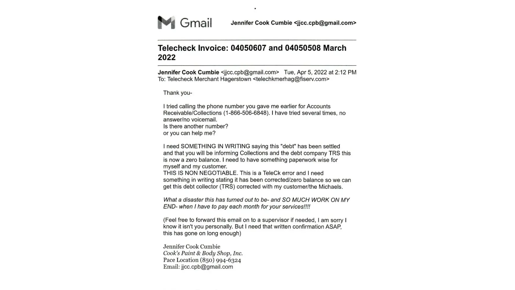 Mar 25, we contacted t-ck Rochelle told us to inform customer to disregard notice from TRS everything was settled. We asked for an email to us and customer stating same. We were told in 3-5 business days we would receive email and customer would also. To date no such email has been received and I have called numerous times and been told the same thing 3-5 buss. days will rec email.