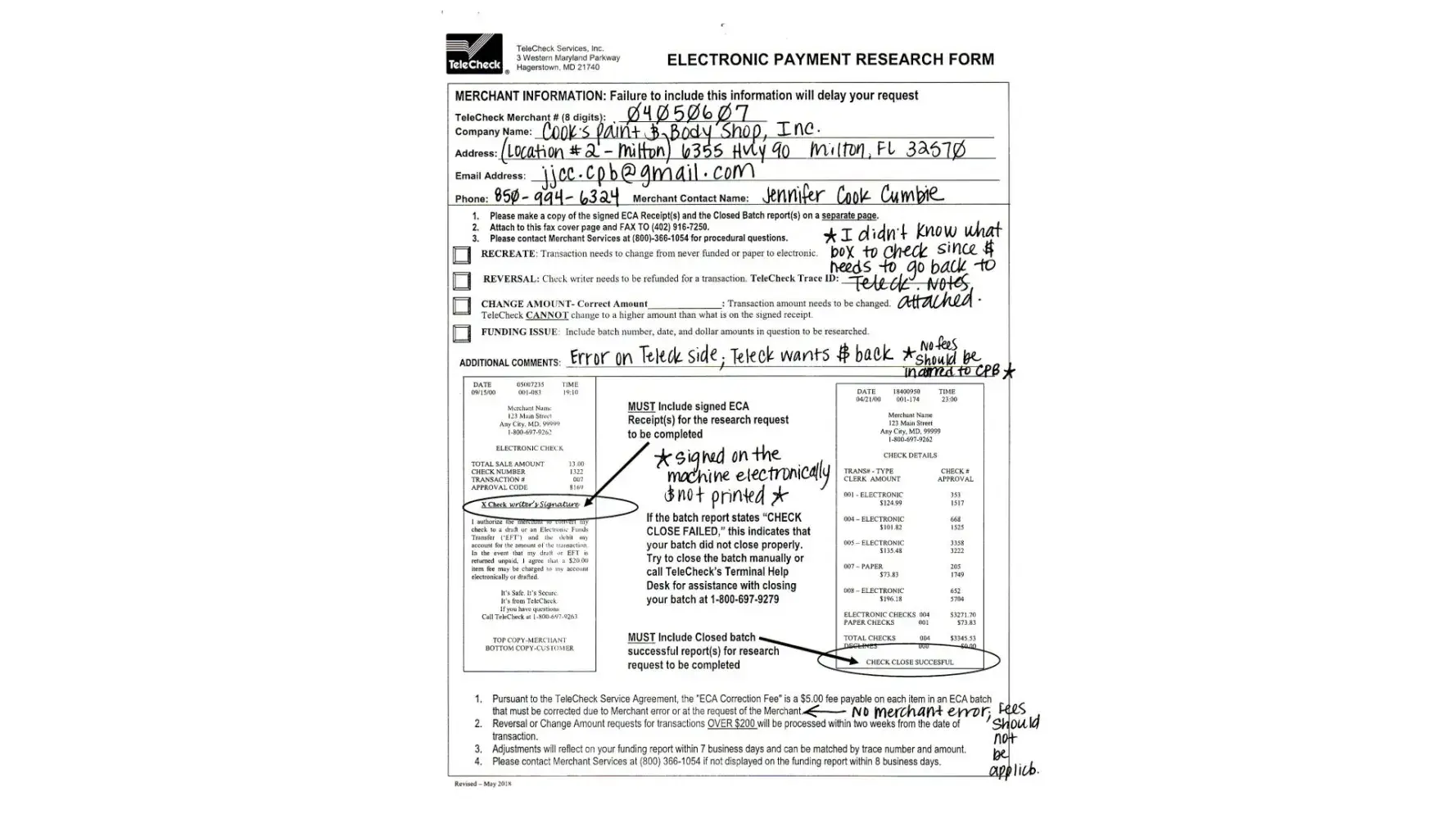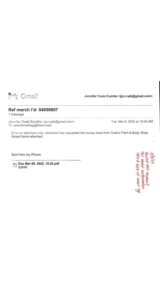 Jan 14, 2022 customer picked up vehicle paid with a check. We ran through our telecheck equip. Jan 18 customer called concerned funds never deducted from account. Mar 7 customer again called funds never ded from acct.---We called telecheck to inquire; funds had been deposited into our account.--Customer came into our office, we called telecheck, spoke with Andrew, he informed us t-ck was using wrong bank acct #. Andrew stated cust. "record" should not be "tainted" as their correct acct was never used. further stated T-ck could not process anything further on this claim. We had been charged 12.80+5.00 for t-ck error, asked for refund. To date refund has not been received.
