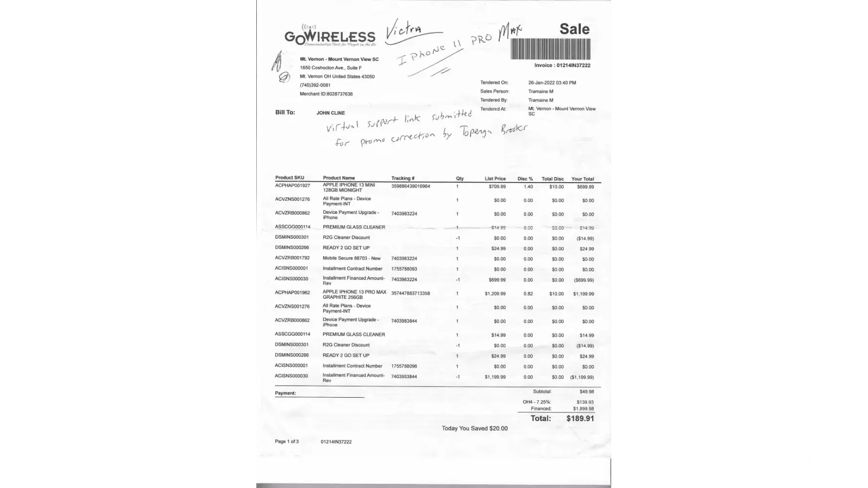 On January 26,2022, I went to GOWIRELESS Verizon store in Mount Vernon OH 43050, to purchase a new phone for myself. The salesperson helped me purchase the new phone. However, in reviewing my wife's and my joint account, he stated that my wife's Apple I Phone 11 Pro Max was eligible for an upgrade. He proceeded to explain that we could trade her phone in...