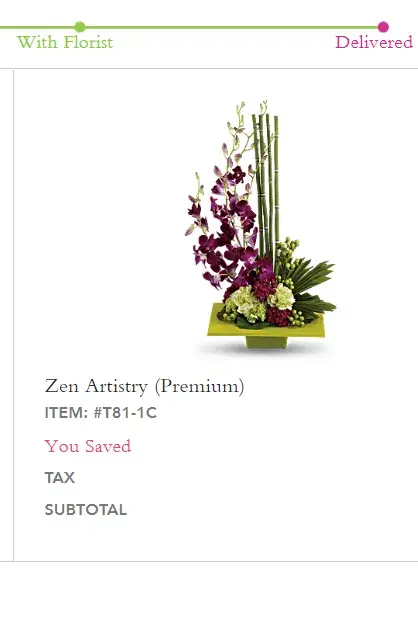I ordered item # T8birthday gift 1-1C, "Zen Artistry" as a birthday gift for my eldest daughter who is celebrating a landmark birthday. While I know that Teleflora reserves the right to make substitutions, I would think that the substitution would be in line with the floral design AS ORDERED. Instead what was delivered was a generic floral bouquet not even close to the floral design that I ordered. Had the florist called to say that they had nothing close to this design, I would have been disappointed, but would have looked for something that they could sub in which would still have a similar aesthetic feel to the item that I ordered.