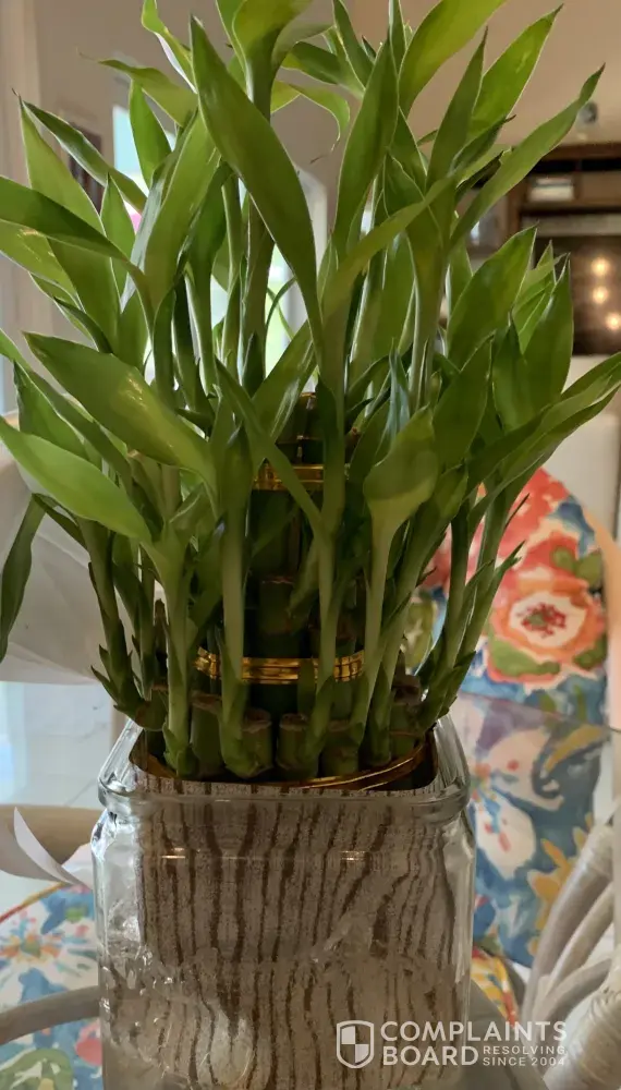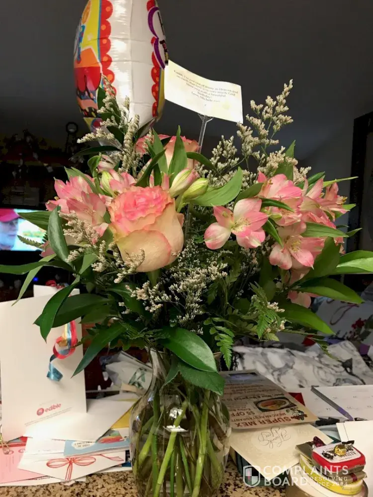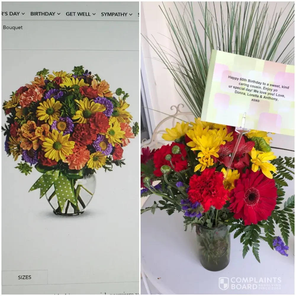 Order #: [protected]. On April 19, 2021 I ordered "Make a Wish" - Deluxe bouquet for my cousin's birthday today. Order number: TEV13-6B. It was delivered on April 21, 2021. I ordered this flowers because of the way they looked on your website. The flowers she received DID NOT look like the flower arrangement you presented on your website. Yes the flowers are similar but they look like they ready to fall apart; they look old, not fresh. The vase did not come with the green polka dot ribbon you displayed. The vase was filled with soil so it looks dirty. They added a big green spray which was not presented in the picture. The vase was round on your photo and I received a different vase. A friend of mine recommended I use Teleflora. I am disappointed and unhappy the flower arrangement arrived to her home looking the way it does. I am requesting to be reimbursed for this false advertising.
