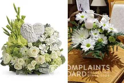 WOW Worst ever experience and service for a florist ever. I ordered a sympathy Deluxe floral bouquet "Teleflora's Hearts In Heaven Bouquet" with a porcelain heart with poem (with a loving message of sympathy for a Funeral. Message on sculpt reads: "Because someone we love is in heaven, there is a little bit of heaven in our hearts.") on it and the main reason I bought this one. What I got a bouquet that was 1/3 the size and fullness shown in the photo on the website (see photo comparison). Also the photo on website is the photo of standard bouquet I ordered the Deluxe one. Also there was no porcelain Heart which was again the reason I paid $80 for it. I got a small angel instead. I also ordered this during a chat session and they confirmed several times they had and it would be great. They did not even call first to tell me that order changed just delivered it hoping I would not notice or find out. After I complained asking they deliver what I ordered they refunded me some of the cost, which I did not ask for. I wanted what I ordered and the heart I ordered so they can keep it as a keepsake. After emailing and calling them all they did was say sorry and nothing we can do. I think this is a CON to make you pay $80 and deliver a bouquet that is $20 to $30 so they can pocket the difference. NEVER going to use them again for my floral needs!