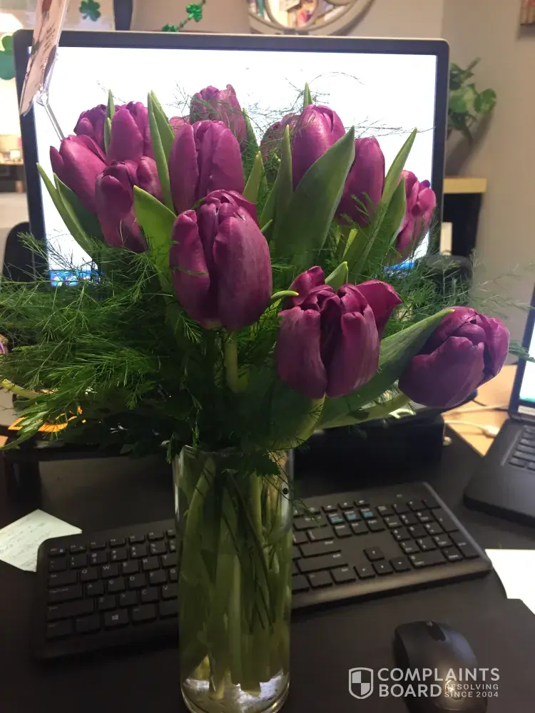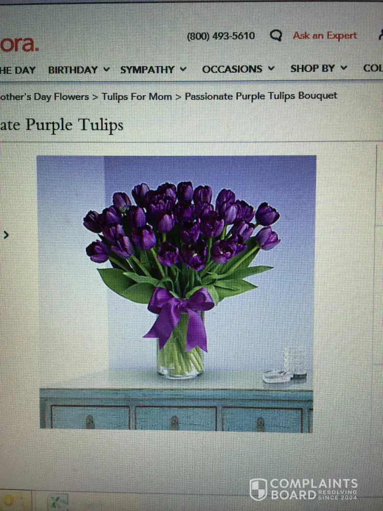 I had paid for purple Tulips delivered to my wife on Valentines day. I paid extra for the premium arrangement. My wife received PINK Tulips arrangement smaller than your standard. The Tulips are filled with GRASS filler since their was only 12 Tulips V.s over 30 and no grass filler in the picture I purchased off of. The vase had no purple ribbon attached like the picture. The Tulips are wilting and have fungus all over them. I have tried for 2 days now to get customer service to answer the phone. I only get automated response that due to high call volume you have to wait longer to speak to someone. After reading your reviews I understand why. Teleflora may be the worst reviewed company in history. what a scam ! I wish I would have read the reviews before ordering. I hope to get the word out and I hope everyone reads before ordering BUYER BEWAR. put this company out of business