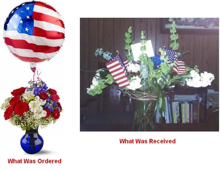 I was shocked when I saw what was delivered - it bore NO resemblance to what I had ordered. The florist has simply clipped off a few branches from an hydrangea bush, added some fake red berries, a few blue and white flower stalks, stuck in a couple of flags, and called it done - and this cost $70+!
