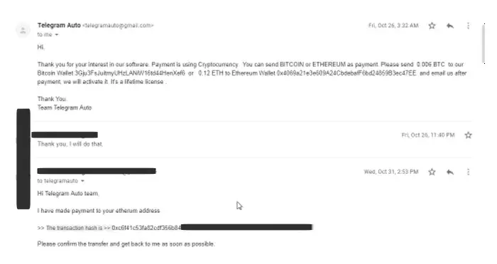 Telegram Auto scammed me recently and i lost all the Bitcoin money i sent to them for the software. Last month October 26 2018, i chatted Telegram Auto to know if their software is in good standards and they told me it is, and i was told where to pay which is their bitcoin or ethereum wallet. I had to borrow fund from my friend in etherum which is 0.12...