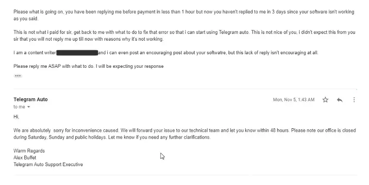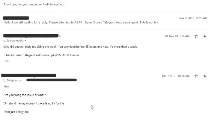 Telegram Auto promised to give me a working product that was capable of doing telegram marketing. Telegram Auto never delivered on their promise. They took my deposit but it never worked. Right from day 1 it was useless and they are not replying to mails nor refunding my money. Telegram Auto is run by cheats and frauds. Telegram Auto should be blocked from...
