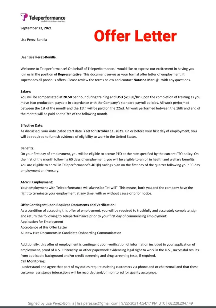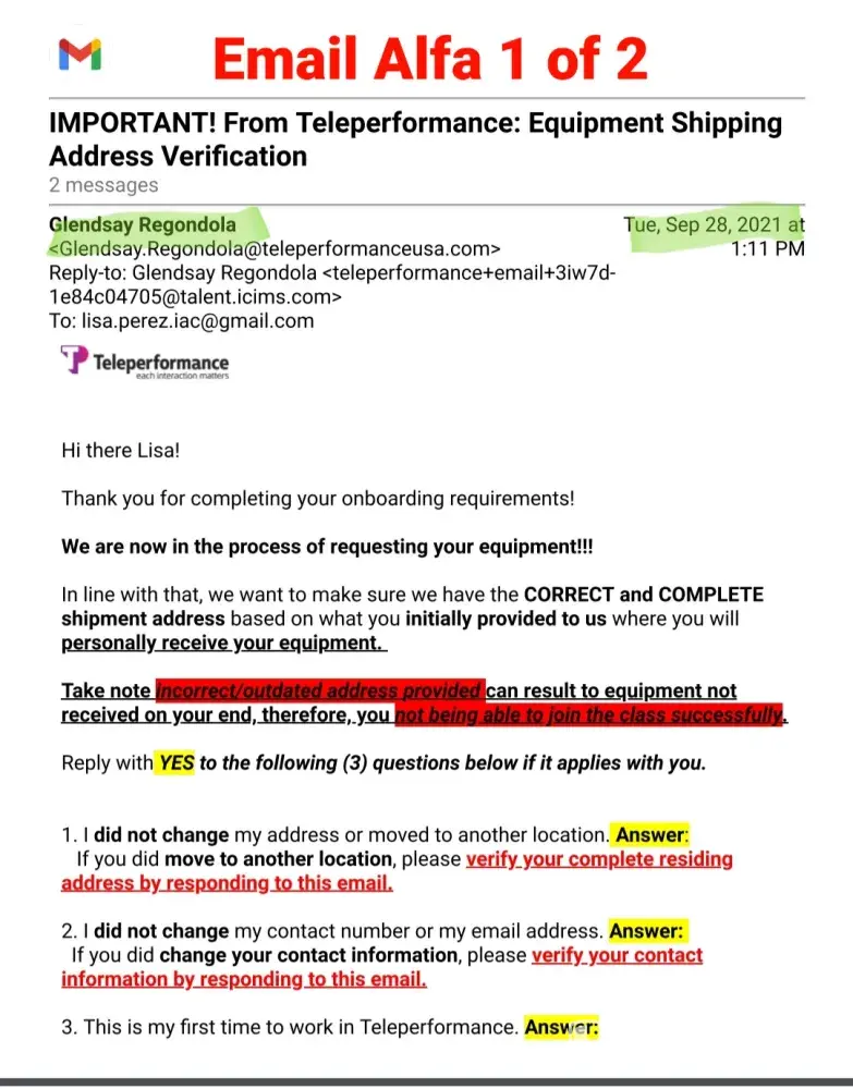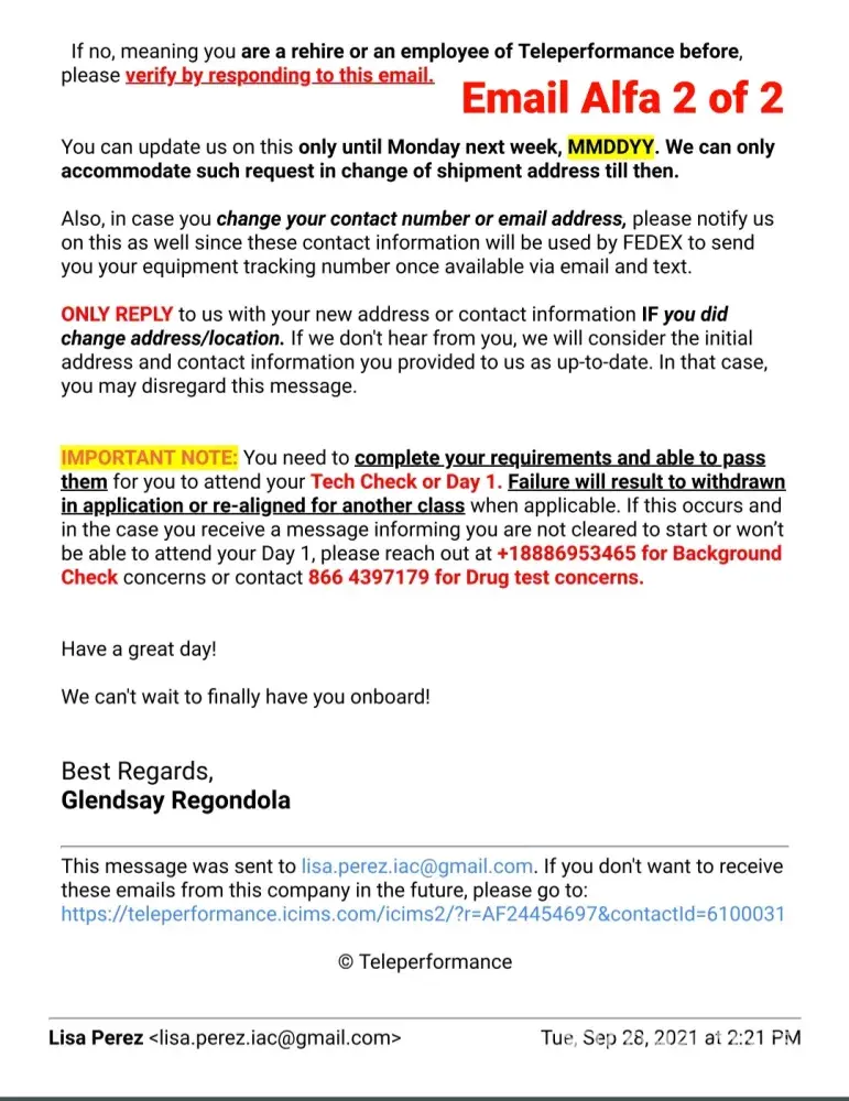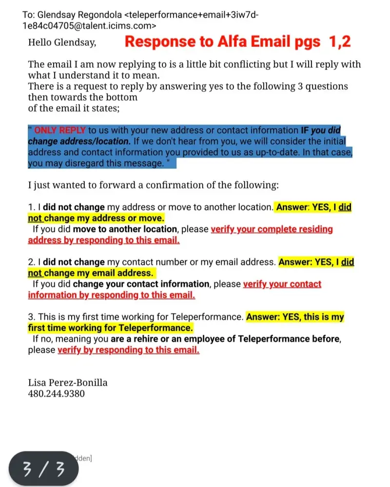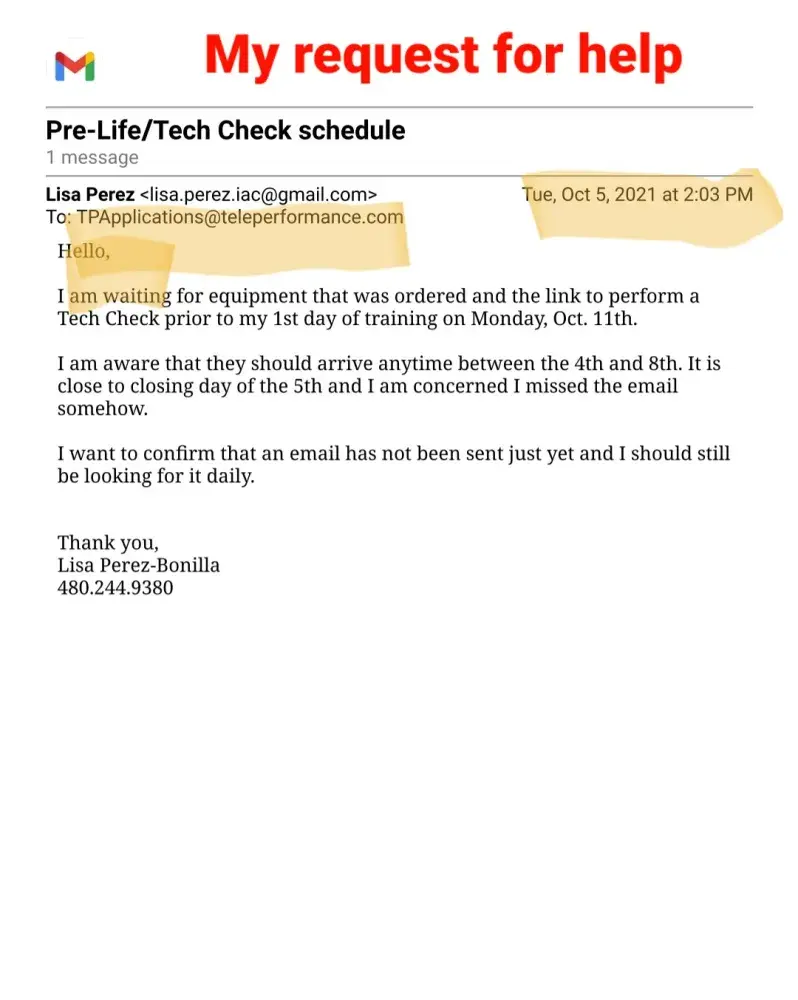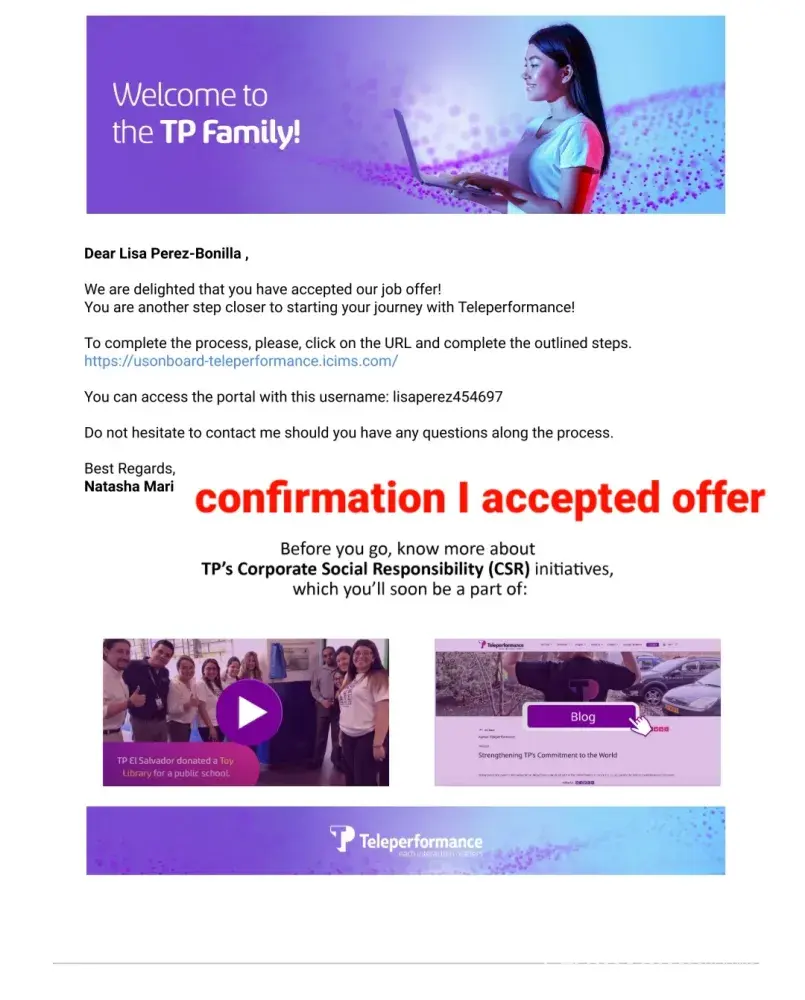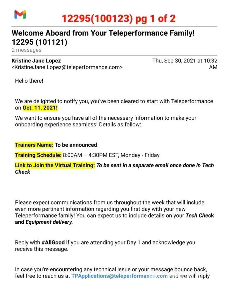 Sorry to hear you are going through the same problem. If you want to get any response from them I would say to post your situation on "Glassdoor ." I did post my complaint with them and got a canned response stating that they "care deeply" and to contact them to resolve the matter. Their response was as worthless as the employment offer I accepted. The phone number they provided was a recording of one ad after another asking for a response of "yes" I want more information or decline it, just to hear another ad. After I declined every ad, it drop me from the call. I tried 3 times to reach someone and got the same result everytime. All I could do was email them (again with the email they provided on glassdoor) that included all the documents I have posted here. About 2 weeks later I recieved a reply about my email that said "This is noted. I already forwarded your concern to the appropriate team. Please expect them to take action as soon as possible." Well, that was 6 days ago and have not heard from anyone yet. So now I have THEIR computer taking up space in my office. I do have a return shipping label to send it back but I am not going to send it to them until I hear from someone about my problem with their company. For clarification, I'm not keeping their computer out of spite. I am keeping it out of concern that they will say they never recieved it and claim that I must repay them for its value. If it were any other company, I would have sent their equipment back right away but then again, I don't think any other company is as incompetent as Teleperformance.