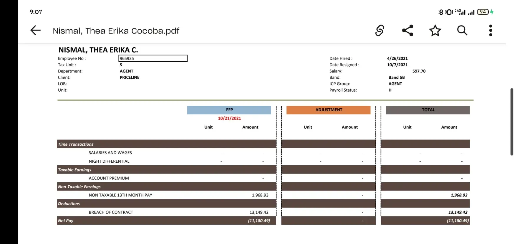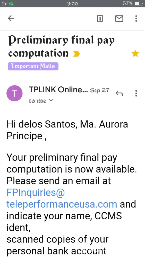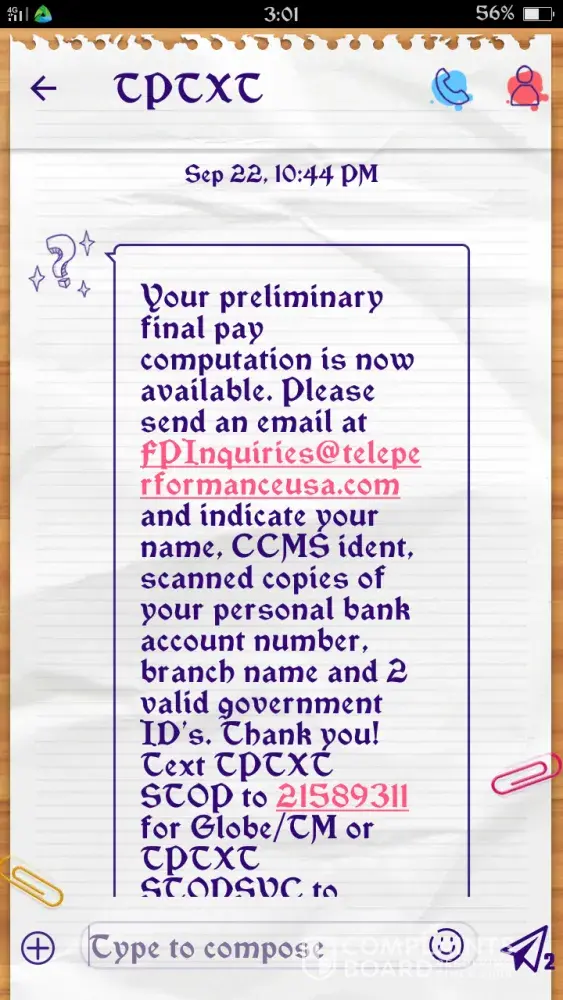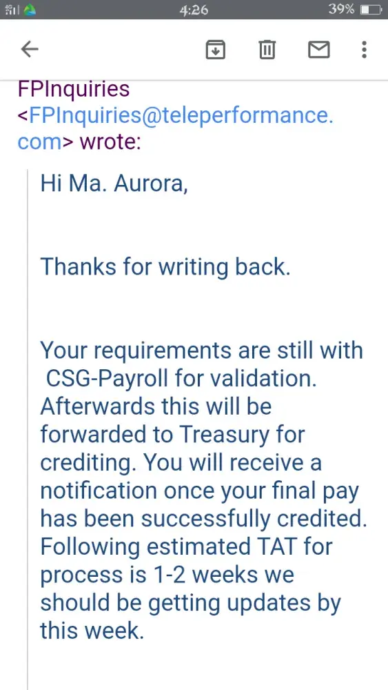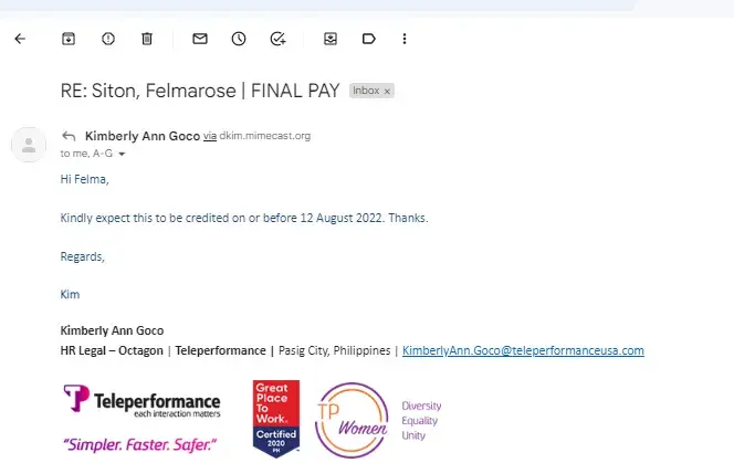 I left Teleperformance around March of this year. I have not processed my clearance right away because of the pandemic. Since then I knew that I was not expecting I was going to get my final pay. Until they have sent me a text message (see the document attached) from Teleperformance saying that my preliminary final pay computation is ready. So I had responded to the text since I'm unemployed my family could really use the money. Besides I worked for it. I know that their computation is wrong because the 3 days that I was sick and I had gone to the doctor in which I submitted the original fit to work letter to the site clinic and did not make myself a copy that's why I did not mention it any longer to them cause I don't have a copy of my fit to work. But I was so sure that my superviaor said that I can use the sick leave benefit that we automatically get on the 3rd or 6th month working for the company. Up to now they have not forwarded my final pay to my payroll account.