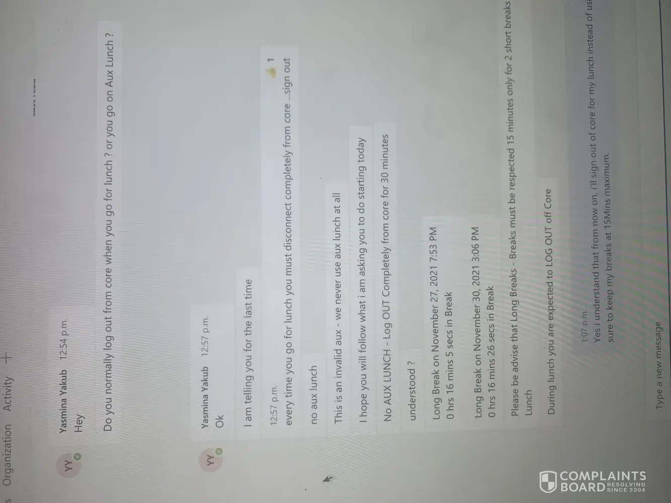 Since I have filed a complaint regarding Yasmina Yakub and her lack lustre abilities when it comes to team leading, She has been threatening to terminate me, would constantly try to intimidate me. Today she called me before I started my shift and told me she'd be firing me for 2 reasons.