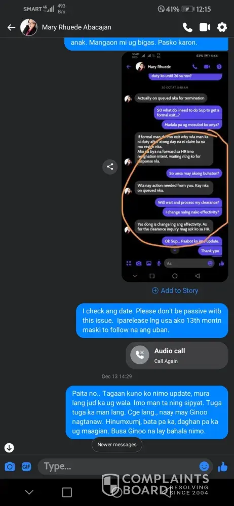Ms. Rhuede Abacajan was just lying to me and there were no endorsements submitted to HR. This is teminating without due process. Last Dec. 7, 2021 i made a follow up for my last pay but HR has no info about ths termination or even my resignatilon. It was on this date that my Sup, submitted the endorsements and the termination process was made. And now i have to wait again for another 30 to 45 days for my last pay to be release. I have been requesting to HR (Paul Alfred Guantero) but it seems I was not given the chance. They seem to ignore my multiple request which left me absorbing all the consequences of Ms. Rhuede failure.